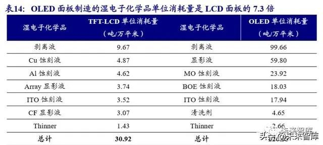 中国大陆面板产业崛起,推动国内湿电子化学品需求增长提速。截至 2018 年底, 中国大陆已经建成投产的 LCD、OLED 面板生产线产能分别为 1.13 亿平米、201.80 万平米。由于 OLED 面板对洁净度的更高要求以及蚀刻工艺的差别,同等面积 OLED 面板制造所需要的湿电子化学品用量比 LCD 更多。根据湿电子化学行业协会数据, 单位面积 OLED 消耗的湿电子化学品量约是 LCD 面板的 7 倍。随着多个高世代及 OLED 面板陆续产线,国内平板显示用湿电子化学品的需求不断增加。2018 年我国 LCD 面板、OLED 面板用湿电子化学品的消耗量分别为 29.68 万吨、4.40 万吨,同 比增长 13.95%、119.61%。从具体产品种类看,剥离液和 Al 蚀刻液是 LCD 面板制 造中用量最大的两个品种,2018 年国内消耗量分别为 9.28 万吨和 4.86 万吨,而 Cu 电极工艺的发展有望带来 Cu 蚀刻液的用量大幅增长;OLED 面板制造中,剥离液和 显影液的用量占比最高,2018 年国内消耗量分别为 1.93 万吨、1.16 万吨。
