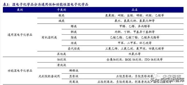 按照组成成分和应用工艺不同,湿电子化学品可分为通用性和功能性湿电子化 学品。通用湿电子化学品以超净高纯试剂为主,一般为单组份、单功能、被大量使 用的液体化学品,按照性质划分可分为:酸类、碱类、有机溶剂类和其他类。酸类 包括氢氟酸、硝酸、盐酸、硫酸、磷酸等;碱类包括氨水、氢氧化钠、氢氧化钾等;有机溶剂类包括甲醇、乙醇、异丙醇、丙酮、乙酸乙酯等;其他类包括双氧水等。功能湿电子化学品指通过复配手段达到特殊功能、满足制造中特殊工艺需求的复配 类化学品,即在单一的超净高纯试剂(或多种超净高纯试剂的配合)基础上,加入 水、有机溶剂、螯合剂、表面活性剂混合而成的化学品。例如剥离液、显影液、蚀 刻液、清洗液等。由于多数功能湿电子化学品是复配的化学品,是混合物,它的理 化指标很难通过普通仪器定量检测,只能通过应用手段来评价其有效性。