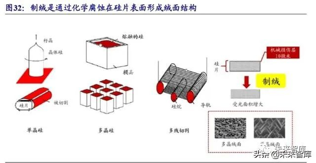 由于太阳能电池硅片切割过程中的线切作用,硅片表面往往存在 10-20 微米的损 失层,因此制备太阳能电池时需利用化学腐蚀去除这层机械损伤层,并进行硅片表 面织构化,即制绒。通过化学腐蚀在硅片表面形成凹凸不平的结构,延长光在电池 表面的传播路径,减少光反射造成的光损失,从而提高太阳能电池对光的吸收效率。同时,绒面也能对后续组件封装的光匹配有比较大的帮助,可减少组件封装的损耗。