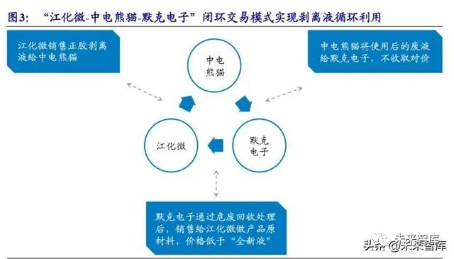 “生产者-使用者-废液处理者”构成湿电子化学品闭环交易新模式。湿电子化学 品的闭环交易模式在国外早有应用,通过引入高水平废液再生提炼纯化商,一方面 解决了化学品使用者的废液处理问题,另一方面也能相应降低化学品生产者的生产 成本,是较为先进的生产模式。随着国内液晶产业的发展,国内液晶面板厂商也开 始广泛采用该模式,如“江化微-中电熊猫-默克电子”的合作,江化微向中电熊猫供 应正胶剥离液,苏州默克将使用后的废液进行回收提纯处理,江化微采购该类回收 液,根据技术和功能性要求,添加部分新液后进行纯化、混配,实现再生利用、绿 色生产。江化微的闭环模式主要是由产品特点所决定:正胶剥离液为混配产品,生 产工艺具有独特性,因此即使是废液回收处理后,由于内部配比关系,回收液通过 再加工也只能被原生产企业和最终客户循环使用。