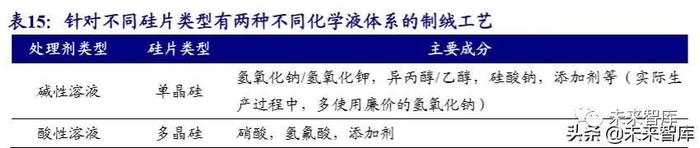单晶硅采用的碱处理制绒,多晶硅采用的酸处理制绒。目前,晶体硅太阳能电 池的绒面一般是通过化学腐蚀方法制作完成。针对不同硅片类型,有两种不同的化 学液体系的制绒工艺,过程中使用的碱/酸处理剂,以及配合使用的清洗剂,都属于 湿电子化学品范畴。单晶太阳能电池片的制绒加工,是利用单晶片各向异性的腐蚀 特性由强碱对硅片表面进行一系列的腐蚀,形成似金字塔状的绒面,所用处理剂为 氢氧化钠(或氢氧化钾)、异丙醇(或乙醇)、硅酸钠、绒面添加剂等;多晶硅片的 制绒加工,是利用强腐蚀性酸混合液的各向同性的腐蚀特性对硅片表面进行腐蚀, 所用的主要处理剂为硝酸、氢氟酸以及添加剂。多晶硅制绒还有机械刻槽、反应离 子腐蚀(RIE)等其他方法,但机械刻槽要求硅片厚度在 200 微米以上,RIE 设备复 杂且昂贵,相对来说,酸性腐蚀法工艺简单、成本低廉,仍是大多数公司的选择。