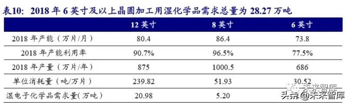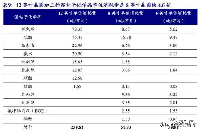 12 英寸晶圆加工主导半导体用湿电子化学品需求。12 英寸晶圆面积是 8 英寸晶 圆的两倍,但其制造过程中使用的湿电子化学品达 239.82 吨/万片,是 8 寸晶圆消耗 量的 4.6 倍,6 寸晶圆消耗量的 7.9 倍,我们测算 2018 年我国 6 英寸及以上晶圆生产 中消耗各类湿电子化学品总量约为 28.27 万吨,其中 12 英寸的半导体晶圆生产线消 耗湿电子化学品 20.98 万吨,约占总消耗量的 74.22%。如果再加上 6 英寸以下半导 体晶圆生产线所消耗的湿电子化学品,以及半导体晶圆加工前的硅片加工用湿电子 化学品,我们预计 2018 年我国半导体生产所需湿电子化学品超过 30 万吨。