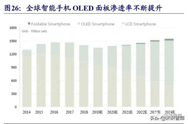 面板行业两大趋势:全球产能向中国大陆转移,小尺寸OLED渗透率快速提升。 根据 Wind 数据,2015-2019 年全球 LCD 面板出货量整体保持平稳,2019 年出货量 为 1.44 亿片,同比略微下降 0.43%;但大尺寸 LCD 面板出货面积仍稳步增长,2019 年同比增长 5.21%。全球面板产业呈现向中国大陆转移的趋势,2016 年中国大陆面 板厂商出货量首次超越中国台湾地区的出货量,位居全球第二,2017 年底国内面板 产能首次超过韩国位居全球第一, 2019年国内面板在全球市场的占有率超40%。IHS Markit 预计,到 2023 年中国大陆的面板出货量占全球的出货量比例将进一步提升, 将占全球总产能的 55%。相较于 LCD 面板,OLED 作为一种新型显示面板,具备厚 度小、可弯曲、色彩对比度高等优点,在智能手机等小尺寸应用领域实现渗透率的 快速提升。根据 CINNO Research 数据,2018 年全球 OLED 智能手机销量 3.70 亿部, 渗透率达到 26.3%。由于柔性 AMOLED 工艺的成熟、成本将接近 LCD,OLED 在智 能手机市场将逐渐取代 LCD 成为共识,CINNO Research 预计 OLED 手机渗透率在 2024 年将达到 69.1%。
