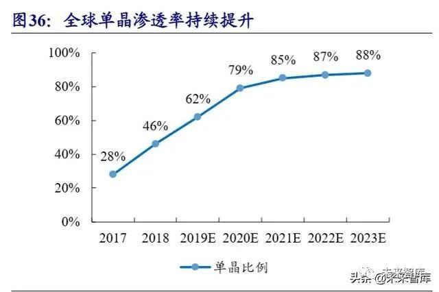 我国太阳能电池片产量持续增长。光伏太阳能作为资源潜力大,环境污染低, 可永续利用,且使用安全的可再生能源,其开发利用受到世界各国高度重视。我国 光伏产业在 2013-2018 年迅速崛起,已经牢牢占据光伏产业链各环节高点龙。2018 年“531 政策”以来,国内光伏产业迎来发展阵痛,新增装机量下滑、产业链价格剧 烈下跌。但受益于海外需求大涨,国内电池片生产端仍在持续增长。据中国光伏行 业协会统计,2019 年国内电池片产量为 108.6 GW,同比上升 24.54%,全球市场占 比达 83%。替代传统能源、光伏产品降本是国内外光伏产业维持增长的驱动力。根 据中国光伏行业协会《2019 年中国光伏产业发展路线图》 ,2025 年国内新增装机量 乐观预期可达 80GW、全球新增装机量乐观预期可达 200GW。从产品类型看,多晶 硅电池片价格快速下滑,企业盈利困难,高效单晶市占率有望呈现不断提升的趋势。
