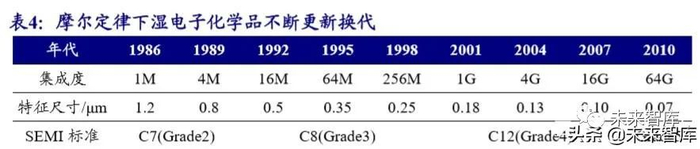 湿电子化学品跟随下游电子信息产业快速更新换代。湿电子化学品作为电子行 业的配套行业,与下游行业结合紧密,素有“一代材料、一代产品”之说。湿电子 化学品下游应用行业主要有半导体、光伏太阳能电池、LED、平板显示等,下游应 用行业的未来发展趋势对湿电子化学品行业有较大的影响。由于电子产业发展速度 非常快,产品更新换代也很快。新产品的工艺特点和技术要求都会发生变化,这就 要求湿电子化学品与之同步发展,以适应其不断推陈出新的需要。以集成电路制造 为例,根据摩尔定律,集成电路上可容纳的元器件的数目,约每隔 18 个月便会增加 一倍,性能也将提升一倍。集成电路性能与半导体制程紧密联系,应用于集成电路 的湿电子化学品从 G2 等级发展至 G5 等级。