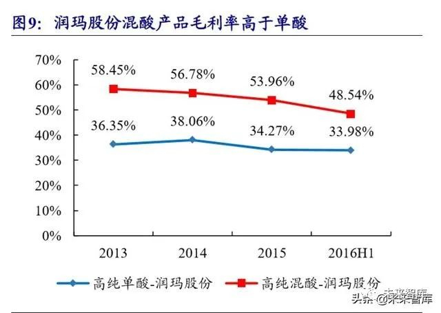 不同于大宗:湿电子化学品的高附加值源于精密纯化与混配技术。湿电子化学 品是化学试剂中对纯度要求最高的领域,对生产的工艺流程、生产设备、生产的环 境控制、包装技术都有非常高的要求,具备较高的技术门槛。与工业级化学品的合 成工艺不同,湿电子化学品在整个生产过程中主要工艺为纯化工艺和配方工艺,该 两大关键技术工艺基本为精密控制下的物理反应过程,较少涉及化学反应过程,不存在高污染、高耗能的情况。同时,湿电子化学品的工艺水平和产品质量直接对电 子元器件的功能构成重要影响,进而通过产业传导影响到终端整机产品的性能,因 此湿电子化学品具有附加值高的特点。以江化微为例,其超净高纯硝酸的平均售价 一般为 2,300-2,600 元/吨,而工业级纯化原料的价格一般为 1,200-1,500 元/吨,提纯 处理后的产品价值量显著提升。功能湿电子化学品的生产工艺更为复杂,除了提纯 外还有混配的过程,对产品的配方、制作参数的选择均十分考验生产商的技术实力 与生产经验。我们分别比较了江化微和润玛股份单酸、混酸产品的毛利率,可见混 配产品与单一纯化产品相比具备更高的盈利水平。