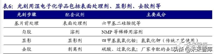光刻工序中,基片前处理、匀胶、显影和剥离步骤需要使用湿电子化学品。光 刻所涉及到的光刻胶配套试剂包括用于光刻胶稀释用溶剂、涂胶前用于基片表面处 理的表面处理剂(如六甲基二硅胺烷)、曝光之后的显影剂(四甲基氢氧化铵水溶液)、 去除基片上残余光刻胶的去胶剂(包括硫酸、过氧化氢、N-甲基吡咯烷酮及混合有 机溶剂组成的去胶剂、剥离液等)。