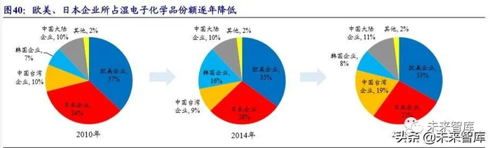 21 世纪前十年代的后期起,随着亚洲其它国家、地区(不含日本)在半导体、 平板显示器、太阳能电池等产业快速发展,亚太地区已成为全球湿电子化学品的主 导市场,其中中国台湾地区、韩国等湿电子化学品生产企业市场份额得到明显的扩 大。陶氏、霍尼韦尔、巴斯夫等公司竞相将电子化学品业务重点放在亚太地区,而 部分欧美传统老牌企业在全球市场的份额上出现明显的缩减。