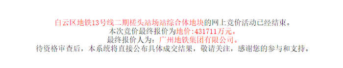 最终,由广州地铁集团有限公司以底价摘得。