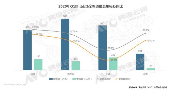 其中空调市场成重灾区,一季度零售量和零售额分别下滑46.6%和58.1%;冰箱、洗衣机、冷柜,分别同比下降22.5%和28.0%、27.8%和35.9%、26.9%和35.3%。