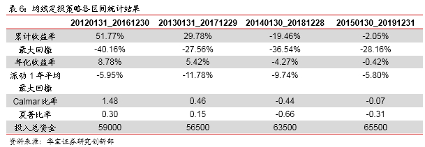 从统计结果可以看到,当资产的年化收益率为负时,定投收益率是高于资产区间收益率的。当资产年化收益为正时,定投收益率则不如一次性买入的收益,这说明当市场下行的时候进行定投会比一次性买入要好,道理也很简单,因为不断下跌的市场中,分批买入较之一次性买入降低了持仓成本。不过,定投作为绝对收益策略,如果收益为负,即便好于买入并持有策略也无济于事,因此我们在选择标的时就需要选取长期走势向上的标的,也即具有正的年化收益的标的。