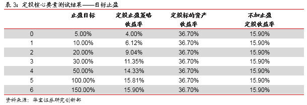从结果来看,加入目标止盈的定投策略,基本是跑输不加止盈的定投策略,说明仅基于收益率的止盈策略,会让投资者获取一定收益就离场,然后下期又要从零开始重新定投,降低了长期定投的平均投入本金,对于一个长期趋势向上的市场而言,显然投入本金越多未来获得的收益也越多。