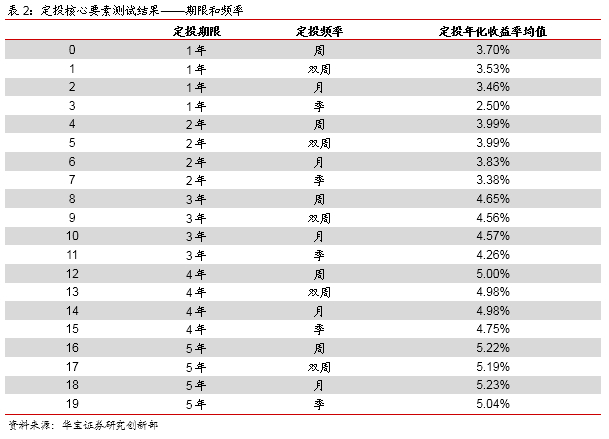 从统计结果可以看到,定投频率对定投绩效的影响并非线性关系,季频表现最差,而其他三个频率表现差别不大,从实际的可操作性来看,月频相对来说是较为合适的。再来看定投的期限,定投的年化收益随着定投期限的延长而逐渐增加,这说明了定投策略比较适合于中长期的时间维度,实践中也常以3年、5年为定投期限。