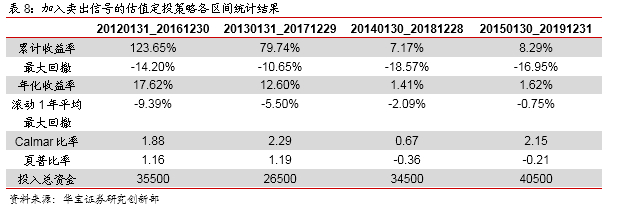 前文基于目标收益的止盈策略分析中,我们指出仅基于定投的目标收益设定卖出策略,由于忽略了市场当时所处的状况,导致实际效果并不十分理想。毕竟市场的涨跌并不会应为投资者自身收益高低而改变,而是由市场自身状况决定的。鉴于此,我们考虑基于市场状况设定离场策略。本文中,我们依旧选取估值指标,基本逻辑就是当市场估值过高时,可能意味着市场的风险也在集聚,高处不胜寒,后续市场大幅下跌的概率也在提升。我们设定了一个多重卖出策略:当估值分位数高于80%时卖出所持资金的一半,当估值突破80%分位数,且标的资产价格自高点回落20%则将剩余部分全部卖出。可见,两个卖出信号一个是左侧卖出,一个是右侧卖出,故设定多重离场信号,可以较好结合两者各自的优势。