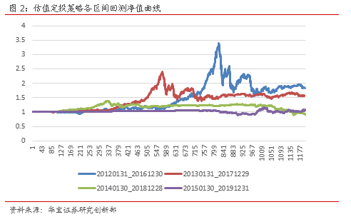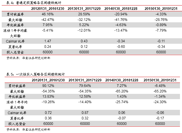 我们将定投频率设定为月频,定投期限为5年。测试时间从2012~2019年,我们以5年作为一个定投周期进行测算,为考虑不同定投起点对定投绩效的影响,我们每次前推1年进行测试。为了将后续各智能定投策略与普通定投以及初期一次性买入进行对比,这里先对普通定投和初期一次性买入两种策略进行回测统计,普通定投每期定投金额设定为1000元。