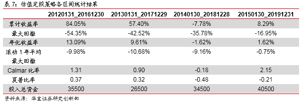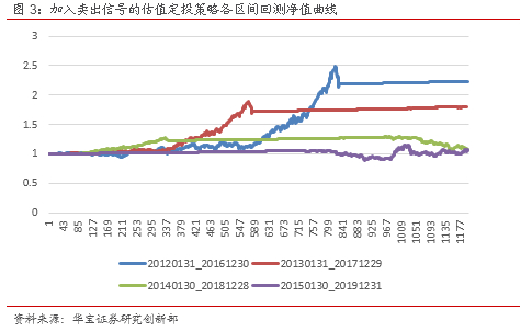 从以上基于估值的智能定投策略回测的统计结果可以看到,该策略收益相比基于均线智能定投策略的绩效提升了不少,尤其是14到18年的亏损幅度明显下降,由原先的-20.94%收窄到了-7.78%,15到19年收益更是变为正值,说明在相对高估的位置不进行定投的策略设定是有效的。但与此同时,5年的平均总投入资金降低到了35000元,平均每个月投入将近600元,仅相当于原始定期定额策略每期投入金额的60%。尽管定投金额有所下降,但是相比于投资者更看重定投的成功率而言,这样的提升更具有意义(实践中,可以通过将资金分散配置于其他拟定投标的,来弥补该定投系统实际投入金额偏少的不足)。另外,我们看到在前两个定投周期中,该策略收益依然跑输了一次性买入策略,这说明这类智能定投策略尽管买在了低位,但是由于没有设定离场机制,导致收益无法得到兑现。因此,对策略的进一步改进,有必要引入离场机制。