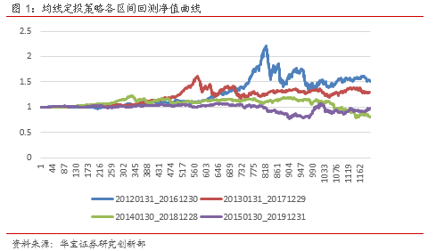 基于上述分析,我们采用两种指标构建智能定投策略,一个是基于纯技术分析手段的均线定投策略,另一个是基于资产自身价值的估值定投策略。我们先考虑将传统定期定额策略转变为定期不定额策略,考察对绩效的影响程度,接下来引入定投止盈策略,考察能否进一步提升绩效。