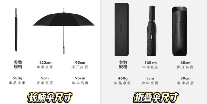 折叠伞的伞面相较普通雨伞加宽15cm,撑开后直径105cm;长柄伞的伞面加宽35cm,撑开后直径122cm。