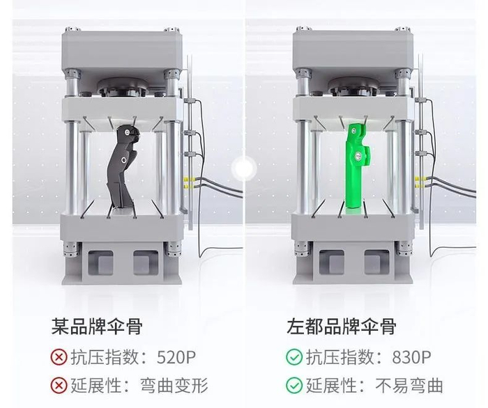 在左都抗风实验室实测中,承受同等压力值时,普通雨伞的关节件明显变形,绿骨关节则不会。
