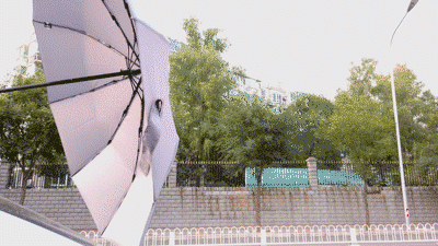 反面开伞时,普通伞骨整个断掉,而左都的弹性伞骨,遇到风暴时“以柔克刚”,翻过来就能接着用。