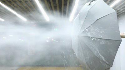 用高压水枪做反应测试,普通的伞打开步骤繁琐,小伙伴也没撑开只能落荒而逃。