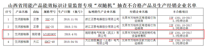 其中,由施耐德电气制造(武汉)有限公司生产的施耐德交流接触器抽查显示JJF 1261.18-2017 5.2吸持功率不合格。不合格产品规格型号为LC1D25M7C,生产日期(批号)为2019.4/01,经销企业为太原市万柏林区施耐特机电设备销售部。