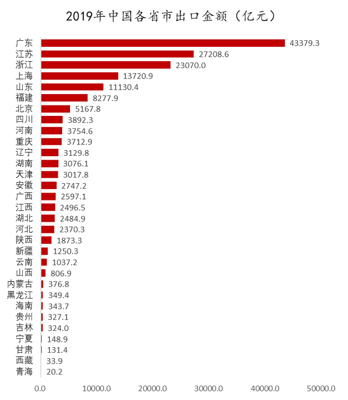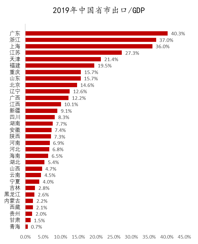 中国商品出口来源地主要集中在广东、江苏、浙江、上海、山东五个省市,2019年一共出口了11.85万亿元,贡献了全国商品出口总额的68.8%,疫情对五省市经济和就业的负面冲击将高于其他省份,假设出口需求下降25.5%,五省市每个月的出口下降约为2500亿元,对当地外贸型企业和就业有很大的负面影响,需要尽快出台一系列措施来帮助外贸型企业生存下来,稳住就业市场。从对出口的依赖度看,广东、浙江、上海三地货物出口占GDP的比值均超过35%,其经济更加依赖于进出口贸易。