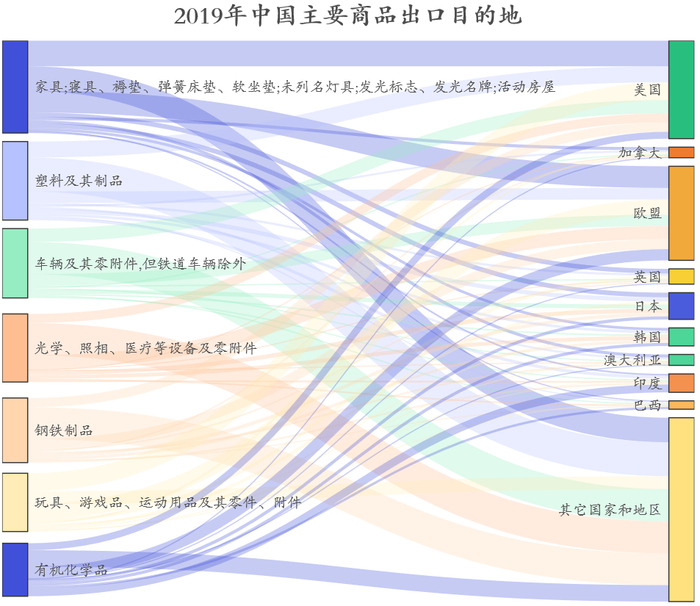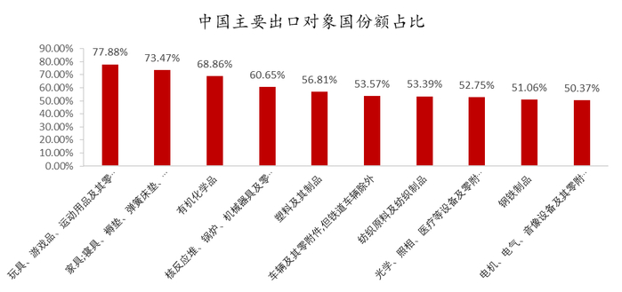 中国前十大类出口商品占出口总量的75%。前十大类出口商品50%以上均流向了当前疫情较重的国家和经济体,其中家具、寝具等(73.47%),玩具、游戏品、运动器材等(77.88%),有机化学(68.86%),核反应堆、锅炉、机械器具及零件(60.65%)流向当前疫情严重国家占比超过60%。这表明,中国主要出口商品需求受疫情影响的负面冲击将很大。