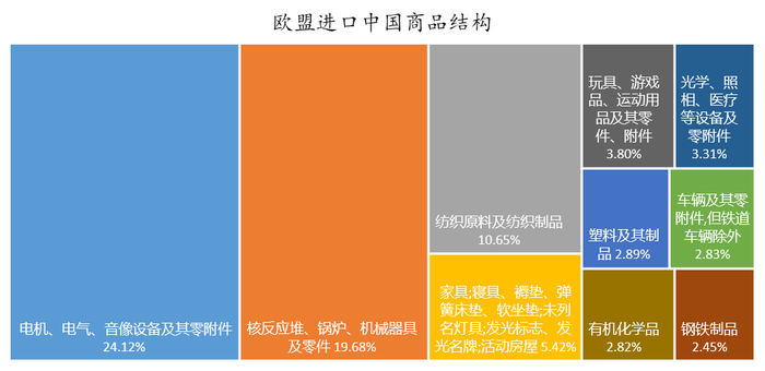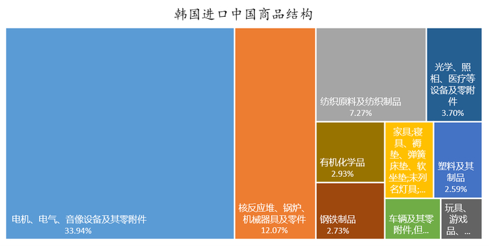 中国主要贸易对象国和地区进口中国商品的结构比较一致,从美国、欧盟、日本和韩国的进口数据来看,第一名为电机、电气、音像设备及其零附件,第二名为核反应堆、锅炉、机械器具及零件,第三名为纺织原料及纺织制品。其他类别商品进口比例上,美国、欧盟、日本和韩国对每类商品的进口比例与中国出口平均水平差异小于3%,比例顺序与中国前十大商品出口顺序基本一致。这表明,国外疫情对中国出口行业的影响大致是同比例的,行业出口规模越大,则受影响的量也越大。
