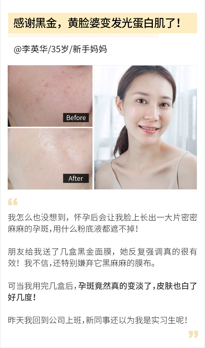 下图小姐姐是标准的大黄皮+痘痘敏感肌!在推荐下用了黑金后,皮肤细腻又光滑,还白了好几个度呢~