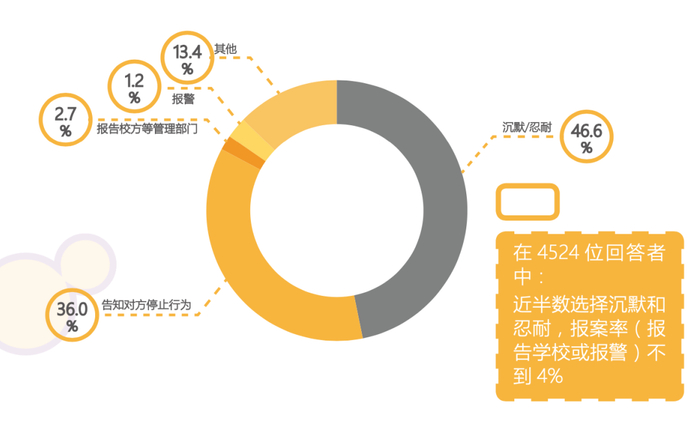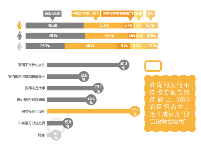 △ 在经历性骚扰后,超过一半的人选择了沉默和忍耐,真正向校方或警方报告或报案的人不到 4%。图片来源 | 《中国大学在校和毕业生遭遇性骚扰状况调查》