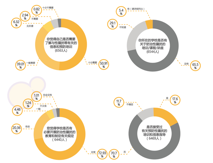 △ 性骚扰预防教育的需求和现状有极大反差:近 9 成学生认为自己需要性骚扰预防教育,超过 9 成学生认为有必要开展防治性骚扰的教育和制定有关规定;但现实中仅有不到 2 成受访者接受过预防性骚扰培训和信息,仅有 5.4% 高校有预防性骚扰教育存在。图片来源 | 《中国大学在校和毕业生遭遇性骚扰状况调查》