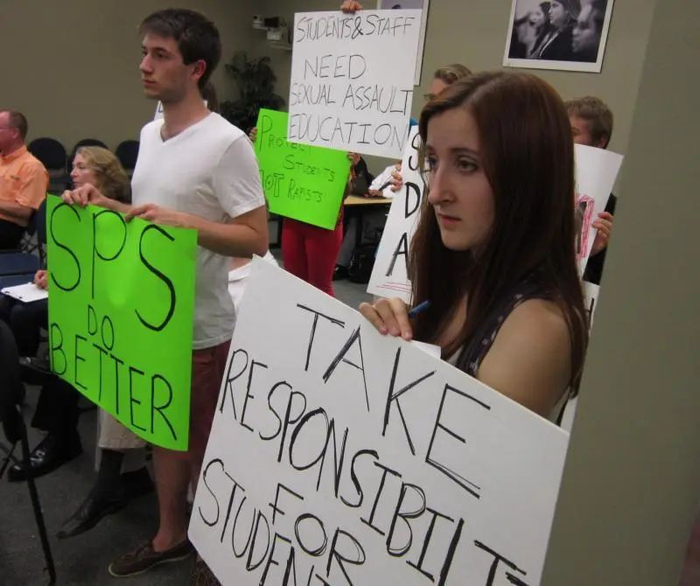 △ 2014 年 8 月 20 日,在美国西雅图教育局的一次会议上,加菲尔德高中(Garfield High School)的校友西尔维·内梅特(Sylvie Nemeth) 抗议该学区对一起 2012 年性侵案的处理结果。图片来源 | KNKX,摄影 | Kyle Stokes