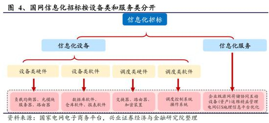 国网信息化招标的标段划分清晰,共分为信息化设备和信息化服务2个大类,其中信息化设备又分为设备类硬件、设备类软件、调度类硬件、调度类软件4个小类。