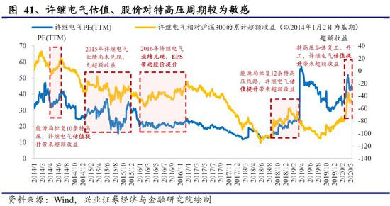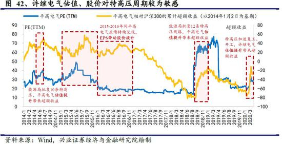 许继电气、平高电气估值、股价对特高压周期较为敏感,主要表现为:特高压投资预期形成时,通常会有一波估值带动的股价提升,但在等待业绩兑现的时间里通常估值会出现一定程度的回调;1-2年后特高压业绩兑现时,又会出现一波由EPS提升带动的股价提升。