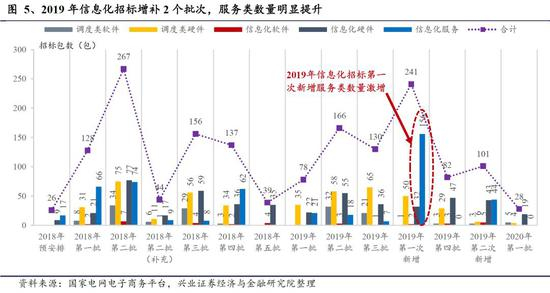 2019年9月起国网信息化招标显著放量,国网电网投资向信息化方向倾斜,结构持续优化。2019年国家电网在既定的4个批次信息化招标基础上连续增补了2个批次招标项目,其中信息化服务类招标数量分别达到156次和44次,份额占比明显高于以往。2020年第一批次的信息化设备类招标也已完成,数量略低于2019年同批次。