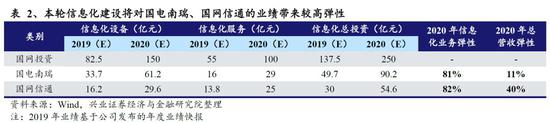 假设国电南瑞、国网信通在2020年的信息化市场份额,国网用于信息化设备与信息化服务的投资比例维持2019年水平,则预期2020年国电南瑞、国网信通的信息化业务同比增长可达81%、82%,信息化业务增量对总营收弹性分别可达11%、40%。