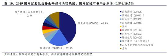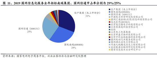 南瑞集团、国网信通(原岷江水电)在国网信息化设备、服务招标中有压倒性的市占率。2019年全年信息化设备、服务招标市占率持续领先。从信息化设备中标情况来看,国电南瑞市占率为40.8%;国网信通市占率为19.7%。从信息化服务中标情况来看,国电南瑞市占率为29%,国网信通市占率为25%。