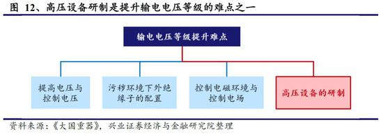 当前中国高压输电技术全球领先,而高压设备是输电技术突破的难点之一。以2009年建成的第一个特高压试验工程投运为标志,中国仅用4年时间就建成了目前世界上运行电压最高、技术水平最先进、拥有自主知识产权的交流输电工程。在输电电压从10千伏逐步提升至1000千伏的过程中,高压设备的研制是提升输电电压等级的主要难点之一。