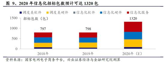 2019年信息化招标总包数与2018年基本持平,鉴于今年国家电网已将信息化作为重点发展方向,预计2020年信息设备类招标同比增长50%,信息服务类招标同比增长100%,总计同比增长65%。