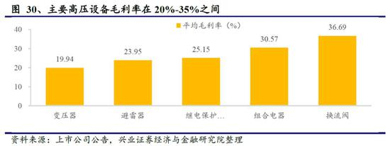 主要高压设备毛利率:20%-35%,不同高压设备之间毛利率差异较大。根据高压设备上市公司营收披露数据,变压器、避雷器毛利率较低,组合电器、换流阀毛利率较高,以继电保护、监控系统为代表的二次设备毛利率分化较大。