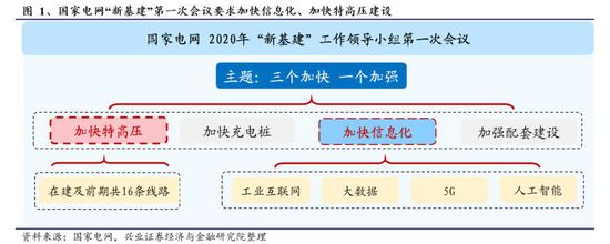 “新基建”第一次领导小组会议指明方向,信息化及特高压需加快推进。2020年4月2日国家电网召开了“新基建”工作领导小组第一次会议,对2020年工作提出“三个加快、一个加强”, “加快现代信息通信技术推广应用”、“加快特高压工程项目建设”赫然在列。这是电力信息化第一次纳入新基建范畴,较为超预期。