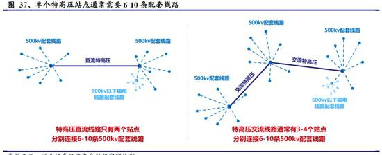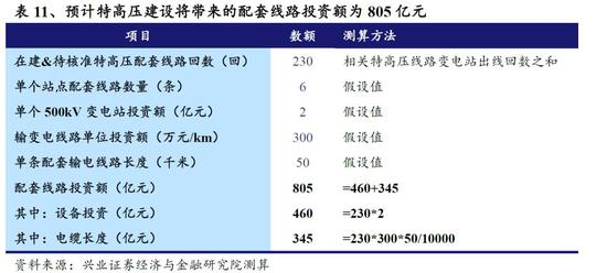 关键假设:直流特高压包含两个变电站,交流特高压包含3个变电站;未公布建设规划的特高压线路单个变电站点配套线路为6条,分别对应6个500kV变电站,单个500kV变电站设备投资额为2亿元,单条配套线路长度为50km,线路材料单位成本为300万元/km,线路材料投资额为1.5亿元。