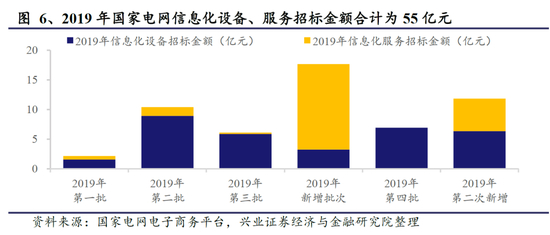 2019年全年信息化设备、服务招标金额共计55亿元,其中信息化设备招标金额为33亿元,信息化服务招标金额为22亿元,招标规模符合预期。9月以来,国家电网信息化设备、服务招标加速,招标金额合计为36.4亿元,占全年招标金额之比为66.1%,且新增的两个招标批次均在四季度发布,验证了我们之前的判断:2019年四季度是电网信息化与通讯建设新一轮投资的起点。
