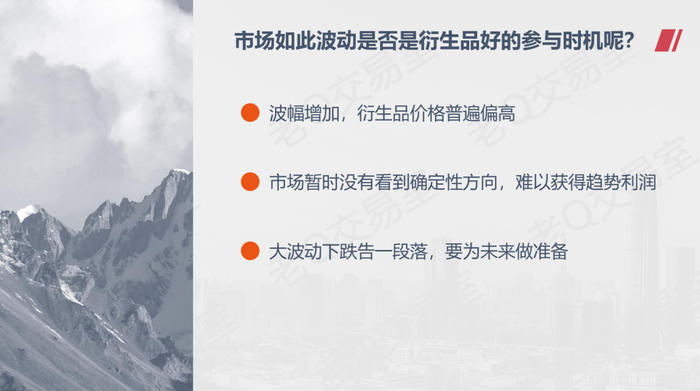 第四个是适当考虑引申波幅,比如最近引申波幅特别高,做衍生品交易的时候就要贴市一点,不要持货太久。