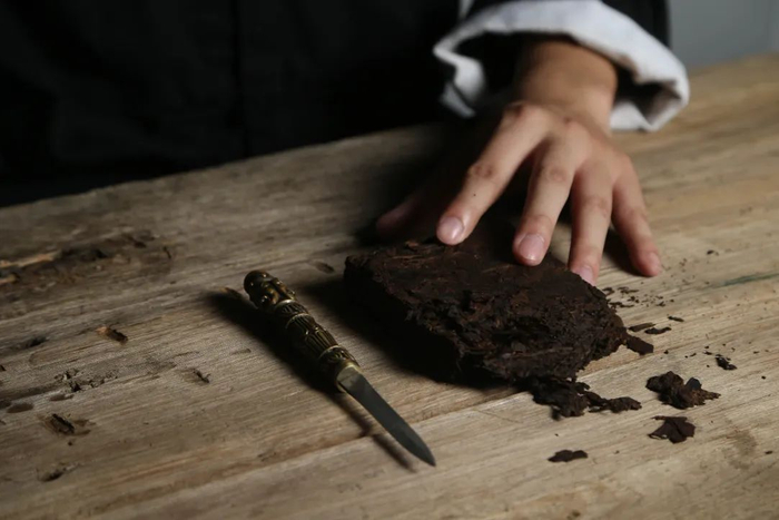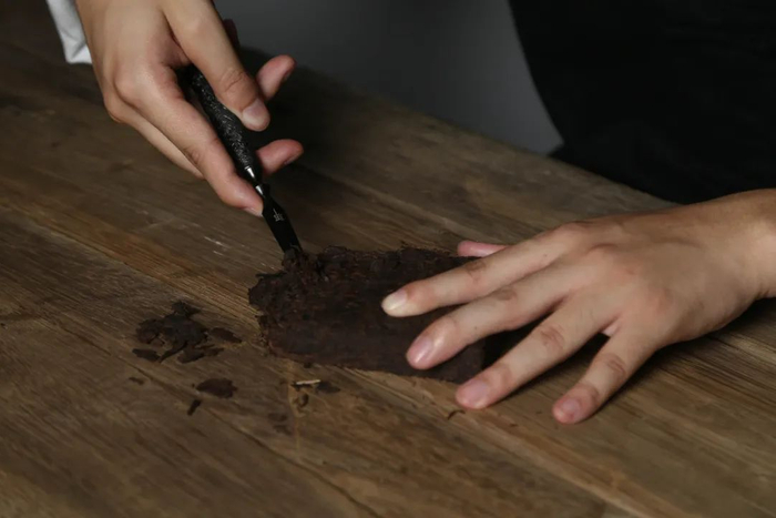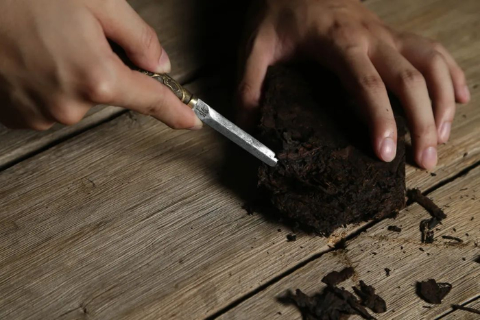 撬茶砖时,一只手固定好茶砖,然后用茶刀顺着压茶的纹理慢慢撬拨成茶片。