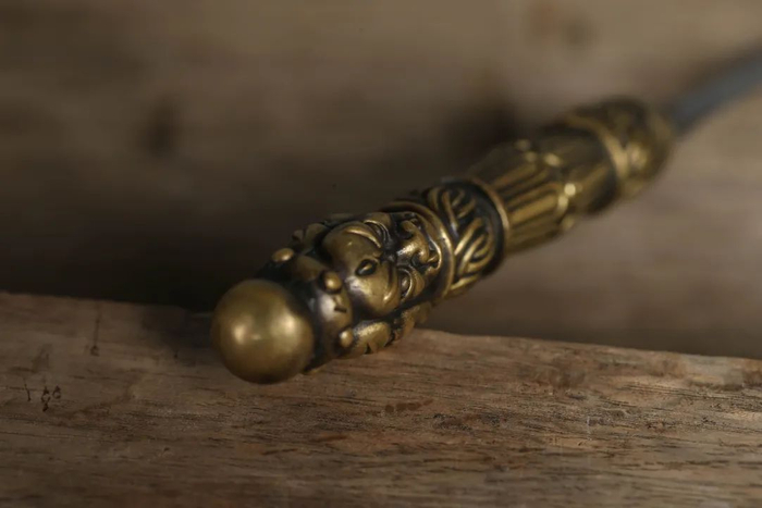 好马配好鞍,手柄采用纯黄铜打造,手工雕刻螭龙,细节精细。
