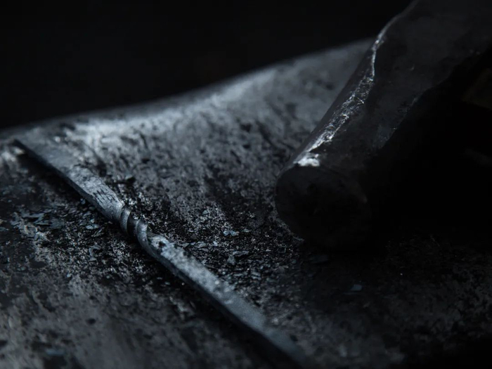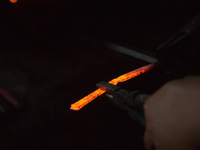 运用龙泉宝剑锻制技艺,将含碳量不同的钢反复折叠锻打。