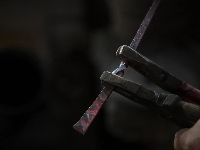将「百炼花纹钢」加温至赤红色再进行扭转。