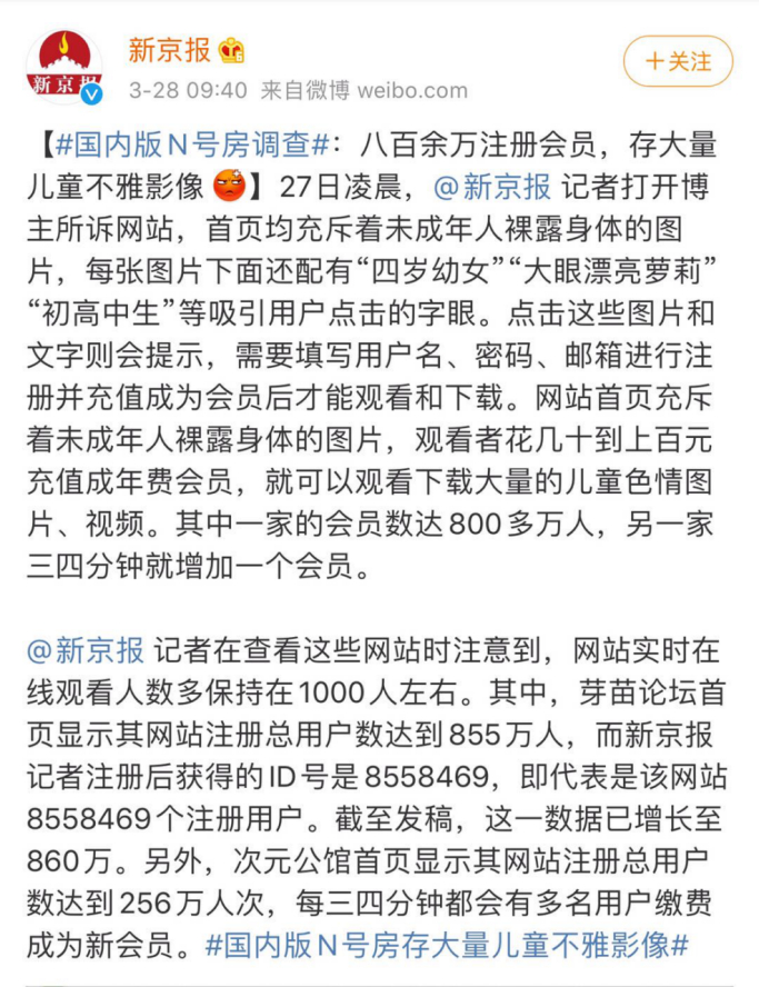 3月28日,韩国N号房事件所牵出了国内存在大量播放未成年性侵影片的网站。